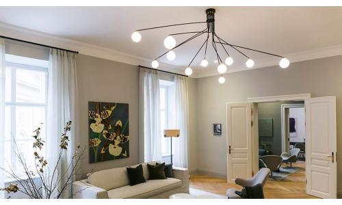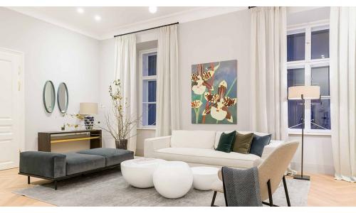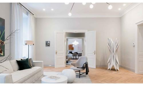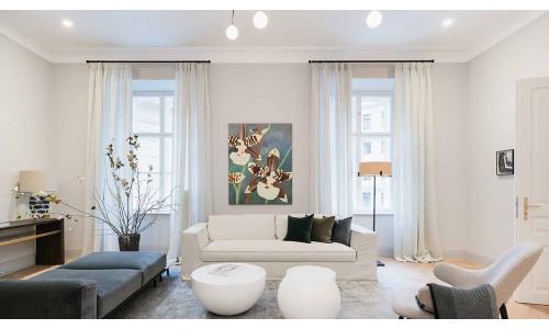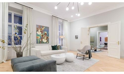 A műemlék lakás felújítása során a cél egy klasszikus, mégis modern enteriőr kialakítása volt. A duplaszárnyas ajtók, a parkettás padló, valamint a látványos stukkó díszlécek mind a régi korok hangulatát hivatottak idézni. Remekül ellensúlyozta ezt a klasszikus beltéri díszítést, hogy a belsőépítész modern bútorokat és kortárs művészeti tárgyakat választott a berendezéshez.