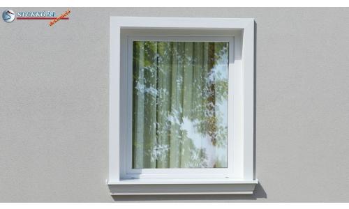 A letisztult ablakkeretezés a jobb oldalon nagyon esztétikus. A díszítés nélküli stukkó ablak köré elhelyezett elemei hangsúlyozzák az ablak oldalait, hiszen a polisztirol profilok kiemelkednek a homlokzatból. Az ablakkeret feltűnő eleme a harmonikus, lekerekített lépcsőkből álló ablakpárkányprofil mintája. Ilyen dekoratív is lehet egy letisztult ablakkeretezés.