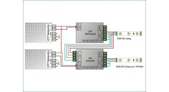 Nagyobb mennyiségű RGB szalagnál valószínűleg több jelerősítőre van szükség. Így egyszerre kezelheti ugyanazzal a vezérlővel az összes LED világítást. Ilyen esetekben ajánlott több kisebb tápegység beépítése, ekkor a kiépítés egyszerűbb. Ehhez tekintse meg példa-kapcsolási rajzunkat. A jelerősítőt használhatja egyszínű LED szalaghoz is. Ebben az esetben az egyszínű LED szalaghoz RGB vezérlő helyett egy dimmer ajánlott.