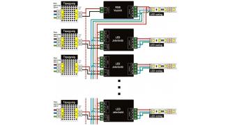 Nagyobb mennyiségű RGB szalagnál valószínűleg több jelerősítőre van szükség. Így egyszerre kezelheti ugyanazzal a vezérlővel az összes LED világítást. Ilyen esetekben ajánlott több kisebb tápegység beépítése, ekkor a kiépítés egyszerűbb. Ehhez tekintse meg példa-kapcsolási rajzunkat. A jelerősítőt használhatja egyszínű LED szalaghoz is. Ebben az esetben az egyszínű LED szalaghoz RGB vezérlő helyett egy dimmer ajánlott.