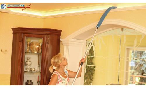 Ezután ragassza fel a többi stukkóelemet is. A LED-es stukkó alsó részénél lévő toldási hézagokat üvegszálas hézagerősítő szalaggal erősítheti meg, a polisztirol profil mintás díszlécén a felesleges polisztirol ragasztót profilsimítóval oszlathatja el.