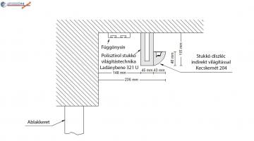 Amennyiben a rejtett világítást az ablak felett is továbbvezeti, a Kecskemét 204 stukkót a Ladánybene 321 U stukkóval kombinálhatja. Az utolsó vázlaton látható, hogy a Ladánybene 321 U díszléc a függönysín előtt van felszerelve. A stukkó első oldalára a Kecskemét 204 LED-es díszlécet ragaszthatja.