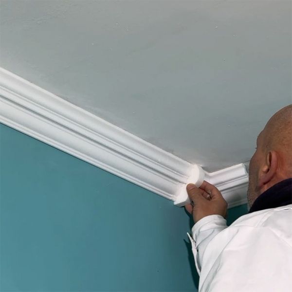 A toldási hézagoknál kitüremkedett felesleges ragasztót el kell távolítani. Kifejezetten erre a célra fejlesztettük ki, a díszléchez illő profilsimító termékünket. A profilsimító szó szerint a díszléc, azaz a stukkóprofil negatív formája, így valóban tökéletesen illeszkedik a díszléc felülétére és a fölösleges ragasztót könnyedén elsimíthatja vele a toldások mentén.