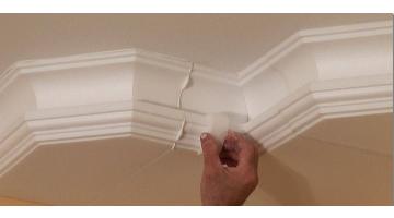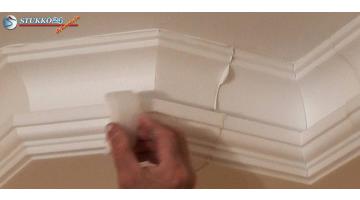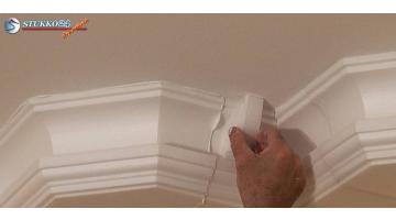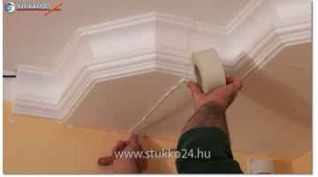 A direkt és indirekt világítás kialakítására alkalmas kombi díszléceket a fal és mennyezet közötti sarokban kell rögzíteni. A LED stukkó hátoldalát a falra, az oldalsó részét a mennyezetre rögzítse. Az egyes stukkóelemeket is egymáshoz kell ragasztani. Amennyiben a fal 4 m hosszú, 2 darab 2 méteres díszlécet ragasszon fel. Pontosan így járjon el a kiegészítőelemek ragasztásánál is. A toldási hézagokba sok polisztirol ragasztót vigyen fel. A negatívprofillal a toldásoknál a felesleges ragasztót egyszerűen eltávolíthatja. A ragasztó száradása után ellenőrizze a toldási hézagokat. Amennyiben csiszolni kell, a vízbázisú festék festése előtt tegye azt meg.