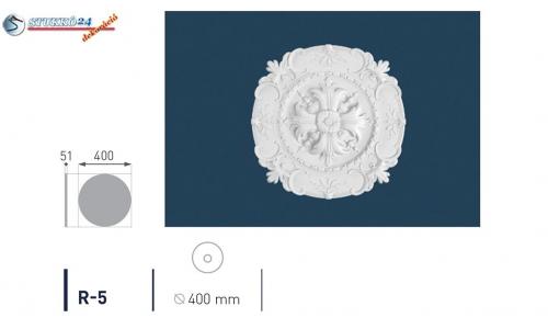 Az R5 stukkó rozetta közepét klasszikus időtlen levélminta díszíti. A középső motívum lapos formában a rozetta szélén visszatér. Ez a stílusosan díszített polisztirol rozetta hangsúlyozza a lámpa szépségét, de tökéletesen alkalmas mandalaként a díszítés nélküli fal és mennyezet felületén. A rozettát polisztirol ragasztóval rögzítheti a mennyezetre és egy Önnek tetsző színárnyalatra festheti. Kérem a polisztirol termékekhez csak vízbázisú festéket használjon!