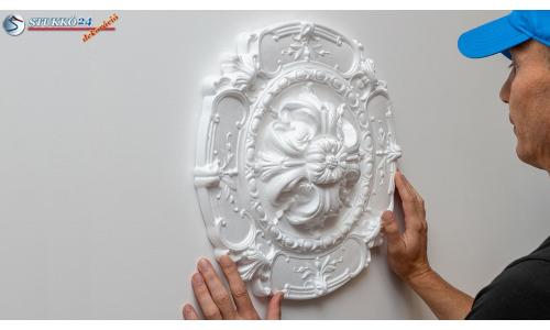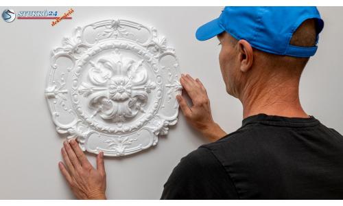 Vigyen fel polisztirol ragasztót hullámos formában a polisztirol rozetta ragasztási felületére, mely általában előzetes hűtés nélkül felvihető. A ragasztó átmérője kb. 1 cm legyen. Szükség esetén a polisztirol ragasztón kívül meleg ragasztó is használható. Ragassza a rozettát a helyére és töltse fel a rozetta és mennyezet, ill. rozetta és fal közötti hézagokat polisztirol ragasztóval.