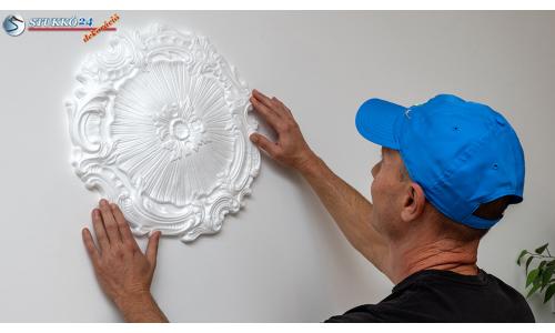 Vigyen fel polisztirol ragasztót hullámos formában a polisztirol rozetta ragasztási felületére, mely általában előzetes hűtés nélkül felvihető. A ragasztó átmérője kb. 1 cm legyen. Szükség esetén a polisztirol ragasztón kívül meleg ragasztó is használható. Ragassza a rozettát a helyére és töltse fel a rozetta és mennyezet, ill. rozetta és fal közötti hézagokat polisztirol ragasztóval.