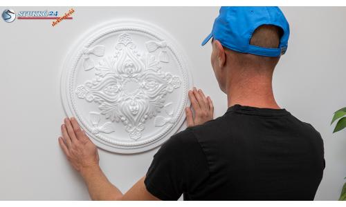 Vigyen fel polisztirol ragasztót hullámos formában a polisztirol rozetta ragasztási felületére, mely általában előzetes hűtés nélkül felvihető. A ragasztó átmérője kb. 1 cm legyen. Szükség esetén a polisztirol ragasztón kívül meleg ragasztó is használható. Ragassza a rozettát a helyére és töltse fel a rozetta és mennyezet, ill. rozetta és fal közötti hézagokat polisztirol ragasztóval.