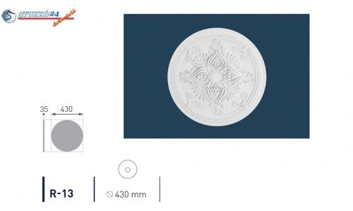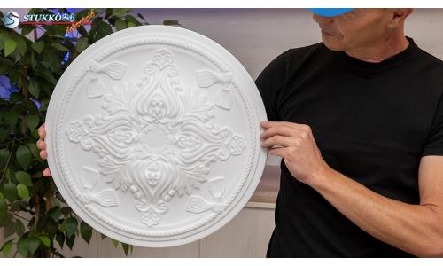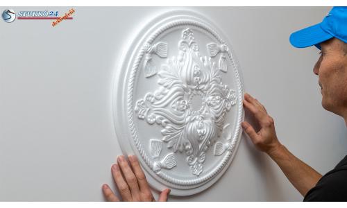 Az R13 stukkó rozettát 4 csillag formában rendezett virág díszíti. A virágmintát 4 zsineg határolja, melynek végeit rojtok díszítik. A rojtok párokban csoportosulnak és a virágok közötti helyet töltik fel. A csodás rozetta kihangsúlyozza a lámpa szépségét, és tökéletesen alkalmas mandalaként üres fal és mennyezet díszítésére is. A rozettát polisztirol ragasztóval rögzítheti a mennyezetre és egy Önnek tetsző színárnyalatra festheti. Kérem a polisztirol termékekhez csak vízbázisú festéket használjon!