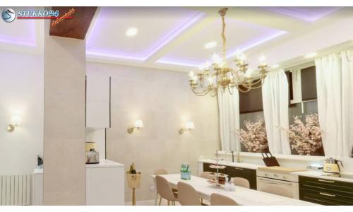 Az előkelő konyha dekoráció és a modern LED stukkódíszítés kombinációja kellemes hangulatot és visszafogott eleganciát teremt.