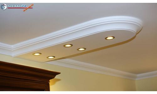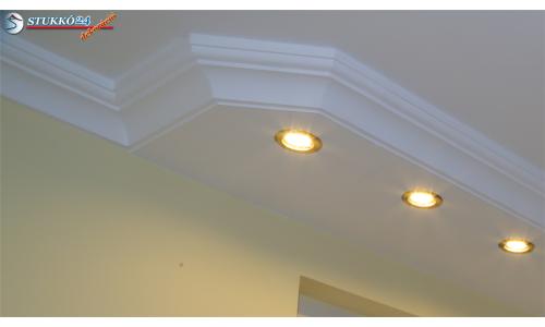 A LED világítással kiépített látványos mennyezet nagyon jól illik a konyha elegáns berendezéséhez, hiszen a LED-es stukkó múltidéző kialakítása modern funkcionalitással párosul. A modern konyha dekoráció LED-es díszléccel gyorsan megvalósítható. A dekoratív mennyezet kiépítéséhez a következő LED stukkóelemekre van szükség: Győr 190+209 Plexi Plus kombi stukkó és a Győr 190+2x209 Plexi Plus polisztirol díszléc. Az U-alakú profil és az L-formájú díszléc átmenetét a fal mentén toldóelem képezi, mely egyedi gyártással valósult meg. Egyedi stukkó elemek gyártását Önnek is szívesen elkészítjük.