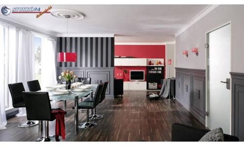 A képeken polisztirol stukkóval megvalósított lakberendezési ötletet és annak két igényesen kialakított részletét mutatjuk. Egy színes modern konyhában és étkezőben elegáns dekoráció a fal és a mennyezet közötti átmenet díszítése, ehhez pl. a Siófok 04 polisztirol holker díszléc kitűnő választás. A holkerlécek használatakor be lehet vetni egy trükköt: Építsen be egy dekoratív stukkót és alatta fesse a falat kb. 5-10 cm-es sávban a stukkóval megegyező színnel. Így a díszléc optikailag nagyobbnak tűnik.