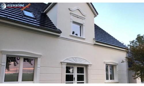 Az alábbi fotókon különböző stílusú homlokzatdíszítési ötletek valósultak meg. Az 1. képen klasszikus stukkó elemeket használtak a homlokzatdekorációhoz: a bordázott mintájú homlokzati profilok, az íves ablakszemöldökök és a gazdagon díszített profilok hagyományos és egységes stukkódíszítést alkotnak. A tetőtéri ablakot az alsó szinttől egy farkasfog mintás kültéri díszléc választja el egymástól, mely a klasszikus homlokzatdekorációt idézi meg. Az osztópárkány kialakítására az Esztergom 107F+117 kültéri stukkó díszléc és a Szolnok 107-F homlokzati profil is kiválóan alkalmas.