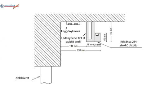 Amennyiben a rejtett világítást az ablak felett is továbbvezeti, a Kőbánya 214 stukkót a Ladánybene 321 U stukkóval kombinálhatja. Az utolsó vázlaton látható, hogy a Ladánybene 321 U díszléc a függönysín előtt van felszerelve. A stukkó első oldalára a Kőbánya 214 LED-es díszlécet ragaszthatja.