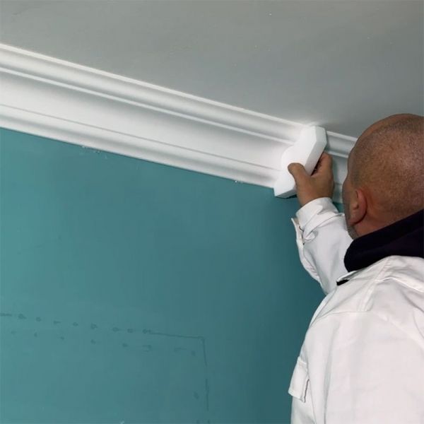 A toldási hézagoknál kitüremkedett felesleges ragasztót el kell távolítani. Kifejezetten erre a célra fejlesztettük ki, a díszléchez illő profilsimító termékünket. A profilsimító szó szerint a díszléc, azaz a stukkóprofil negatív formája, így valóban tökéletesen illeszkedik a díszléc felülétére és a fölösleges ragasztót könnyedén elsimíthatja vele a toldások mentén.