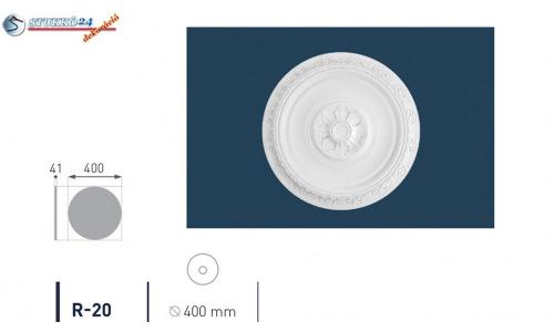 Az R20 stukkó rozettát különböző kialakítású körök díszítik. A külső és belső kör virágmintát kapott. Közöttük több díszítés nélküli kör húzódik, mely hullámos mintát eredményez. A rozetta kihangsúlyozza a lámpa szépségét, és tökéletesen alkalmas mandalaként üres fal és mennyezet díszítésére is. A rozettát polisztirol ragasztóval rögzítheti a mennyezetre és egy Önnek tetsző színárnyalatra festheti. Kérem a polisztirol termékekhez csak vízbázisú festéket használjon!