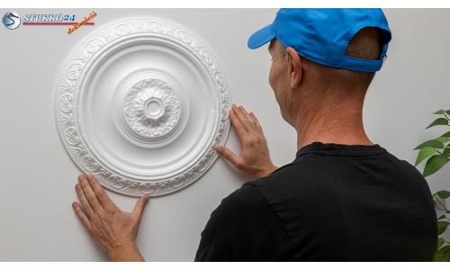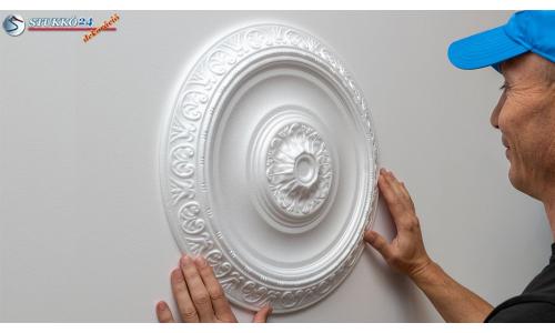 Vigyen fel polisztirol ragasztót hullámos formában a polisztirol rozetta ragasztási felületére, mely általában előzetes hűtés nélkül felvihető. A ragasztó átmérője kb. 1 cm legyen. Szükség esetén a polisztirol ragasztón kívül meleg ragasztó is használható. Ragassza a rozettát a helyére és töltse fel a rozetta és mennyezet, ill. rozetta és fal közötti hézagokat polisztirol ragasztóval.
