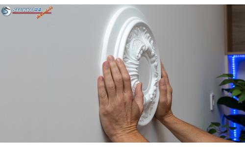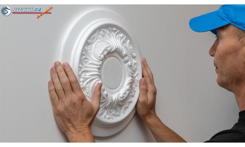 Vigyen fel polisztirol ragasztót hullámos formában a polisztirol rozetta ragasztási felületére, mely általában előzetes hűtés nélkül felvihető. A ragasztó átmérője kb. 1 cm legyen. Szükség esetén a polisztirol ragasztón kívül meleg ragasztó is használható. Ragassza a rozettát a helyére és töltse fel a rozetta és mennyezet, ill. rozetta és fal közötti hézagokat polisztirol ragasztóval.