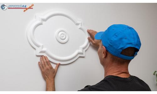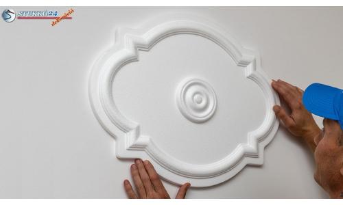Vigyen fel polisztirol ragasztót hullámos formában a polisztirol rozetta ragasztási felületére, mely általában előzetes hűtés nélkül felvihető. A ragasztó átmérője kb. 1 cm legyen. Szükség esetén a polisztirol ragasztón kívül meleg ragasztó is használható. Ragassza a rozettát a helyére és töltse fel a rozetta és mennyezet, ill. rozetta és fal közötti hézagokat polisztirol ragasztóval.