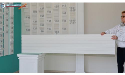 A polisztirolból készült kérgesített stukkó profil Zánka 159 a kéregbevonatnak köszönhetően kiválóan alkalmas kültéri homlokzati díszítéshez. A kültéri díszléc a homlokzatdíszítés során használható például dekoratív kültéri pilaszter, azaz féloszlop kialakítására. A Zánka 159 kérgesített stukkó profil 400 mm széles és 20 mm mély. A bordázott mintájú homlokzati díszlécet 2 méteres szálakban gyártjuk és szállítjuk. Igény szerint a stukkóprofil a beépítés helyszínénen könnyen méretre vágható.