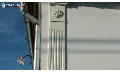 A bordázott mintájú Zánka 159 kérgesített polisztirol díszléc egy modern kültéri stukkó. Egyszerű kialakításának hála mind modern, mind klasszikus stílusú homlokzaton használható. Az alábbi képen egy klasszikus stílusban díszített homlokzatot lát, melyen 3 pilaszter került kialakításra kültéri polisztirol stukkóval. A pilaszterek hosszú testét a sima, minta nélküli Szigetvár 158 kültéri díszléc és a bordázott felületű Zánka 159 kültéri díszléc alkotják. A két pilaszterprofil mérete azonos, csupán díszítésük eltérő. Ízlés szerint választhatja kültéri pilaszter kialakításához a minta nélküli Szigetvár 158 stukkó profilt vagy a bordázott felületű Zánka 159 kültéri stukkót – a két pilaszterprofilt akár kombinálhatja is, ahogyan a lenti képen látható ingatlan tulajdonosai is tették. A képen láthatók pilaszterfők a Nagykálló 156 és Hévíz 157 kültéri díszlécek felhasználásával készültek.